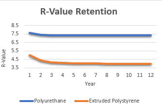 A long-term thermal performance study of extruded polystyrene by manufacturer DOW showed XPS insulation lost an average of 21% of its insulating value over a 12-year period falling to a net R-Value of 3.95 per inch.2 KPS Global freezer panels averaged long-term insulating value is R-7.93. That means the KPS Global polyurethane can provide a long-term insulating performance 100% better than extruded polystyrene (XPS) insulation (Figures 2 & 3).