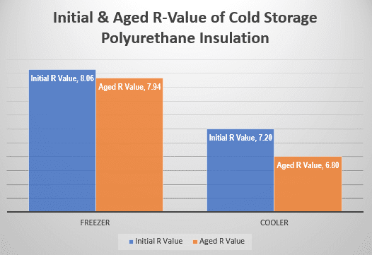While aerogel and vacuum panels offer great insulative performance in certain applications such as ice chests and thermos bottles, their insulation is not manufactured for structural uses. Closed cell polyurethane is in fact the highest performing insulation used in the construction of structural insulated panels for coolers and freezers. Since polyurethane can deliver an insulative value of up to R-8.06 per inch thickness, the KPS Global 5” thick freezer panel can provide an insulative value up to R-40. Below (Figure 4) is a comparison of Polyurethane (what KPS Global uses) insulation initial and aged R-Values for Freezers and Coolers.