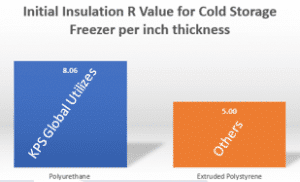 Many ask why is closed-cell polyurethane insulation recommended for use in cold storage building structures. First, it has the highest R-Value of any insulation used in the industry, up to R-8.06 per inch thickness, and is the reason why KPS Global utilizes this kind of insulation. That compares to an R-5 insulating value per inch thickness for the nearest competitor extruded polystyrene (XPS). See Figure 1.