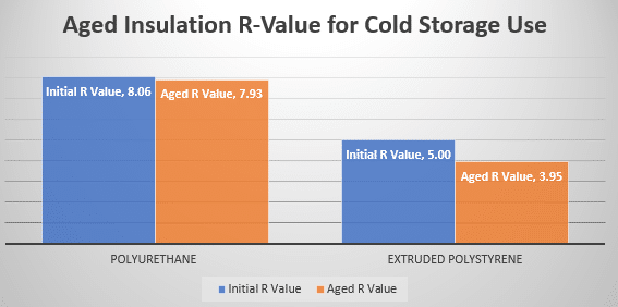 While aerogel and vacuum panels offer great insulative performance in certain applications such as ice chests and thermos bottles, their insulation is not manufactured for structural uses. Closed cell polyurethane is in fact the highest performing insulation used in the construction of structural insulated panels for coolers and freezers. Since polyurethane can deliver an insulative value of up to R-8.06 per inch thickness, the KPS Global 5” thick freezer panel can provide an insulative value up to R-40. Below (Figure 4) is a comparison of Polyurethane (what KPS Global uses) insulation initial and aged R-Values for Freezers and Coolers.