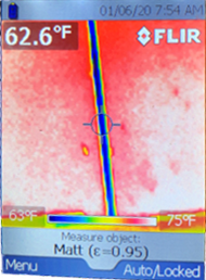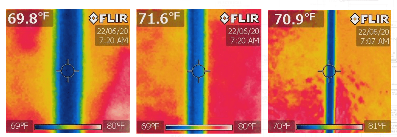 Using a cold storage structural insulated wall panel as an example, the perimeter frame thermal bridge will cause the inside surface temperature of the wall panel in the vicinity of the frame to have a higher temperature than the surrounding polyurethane foam. In an equal but opposite scenario, the same thermal bridge will cause the outside temperature in the vicinity of the frame to have a lower temperature than the surrounding polyurethane insulation.